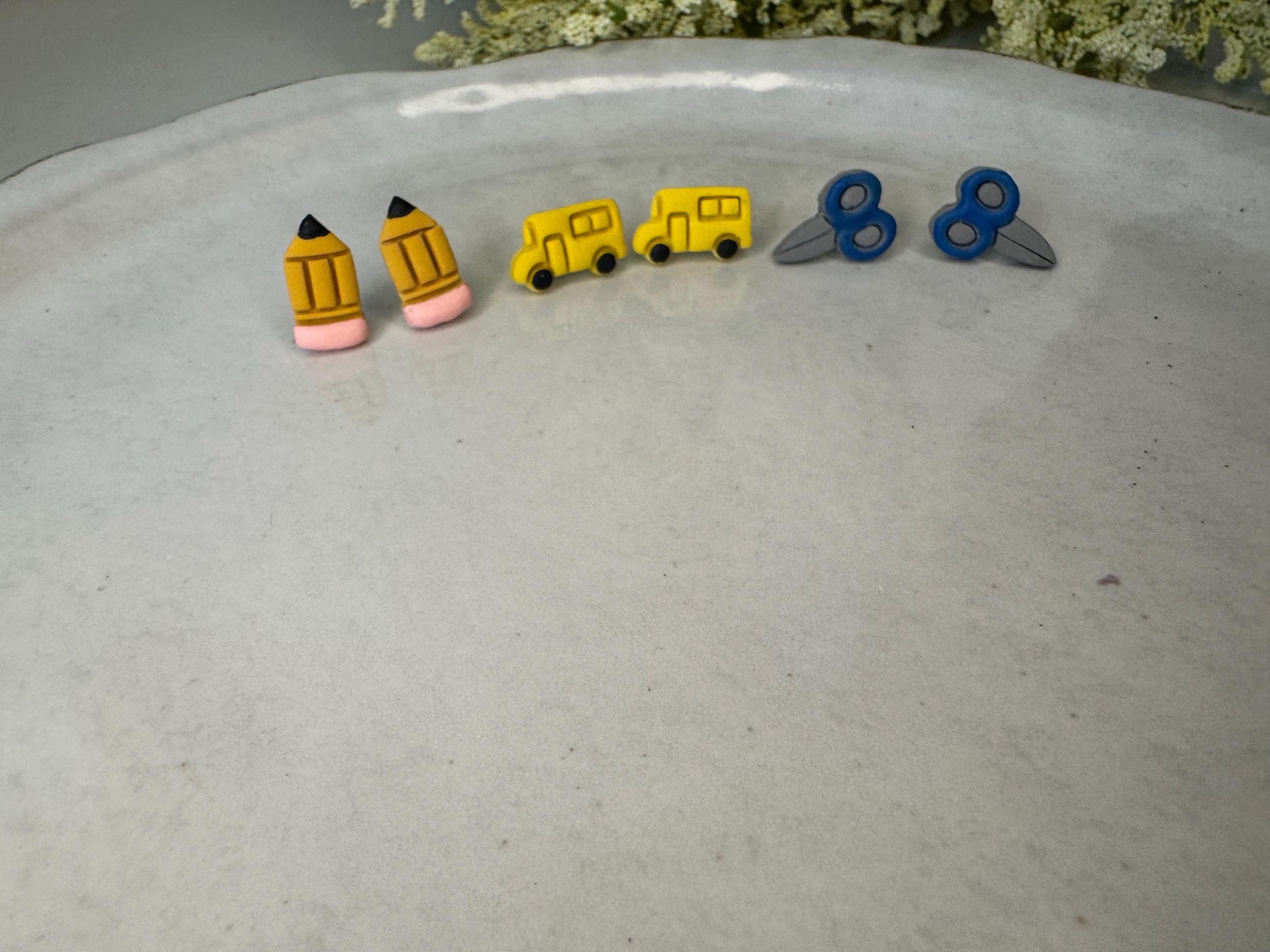 Handmade Polymer Clay Teacher Stud Earrings – Pencil, Bus & Scissors 3 Pack
